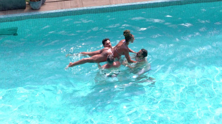 Piscininha, amor! Aproveitando o sol, os participantes do 25 curtem a piscina da casa na tarde desta sexta-feira (24). Aline sugere para Vinícius, Diego Hypolito e Mateus que eles façam uma brincadeira.